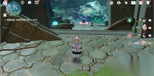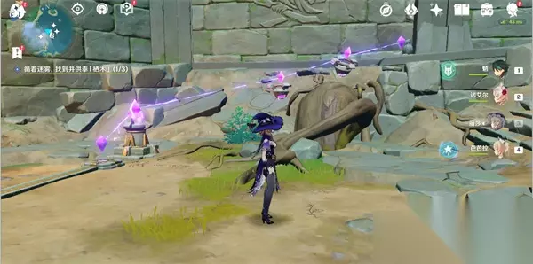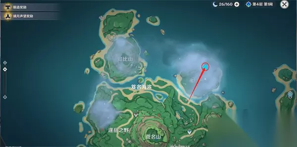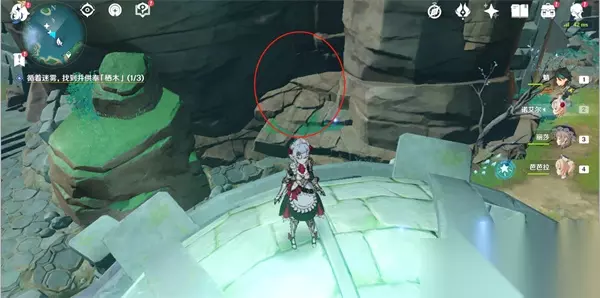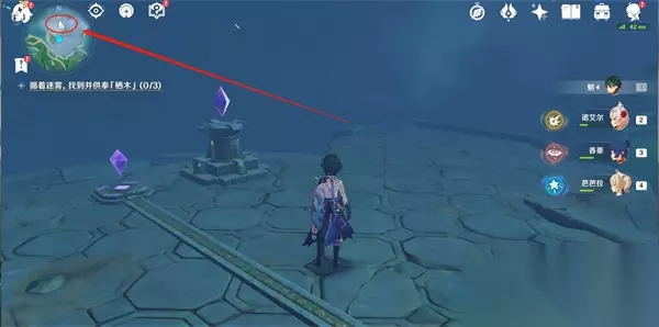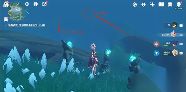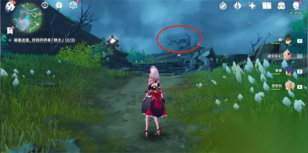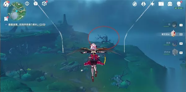 17、连接完毕后,就可以开门,打怪物,拾取羽毛; 三、逢岳之野 18、第三处迷雾,建议先将知比山的传送激活(在山顶上),然后直接从传送点直线飞行(在空中貌似受迷雾影响较小); 19、然后快到时,可以看到一棵歪脖子树(栖木),如下图位置,这样大家进去就可以直接找到阿瑠,对话接任务;