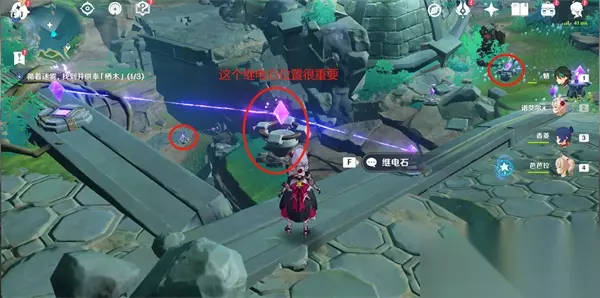 16、3个精灵归位后,排干下面的水,拾取下面的继电石,进行连线(共3个继电石),具体方法如下图圈起来的地方;