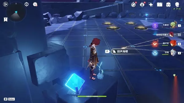 按照下图所示完成解谜,解谜线索在背后的墙上,需要击碎水琥珀,让地面铺满水,显示出完整的线索。并且前方的石墙靠近之后也会消失
