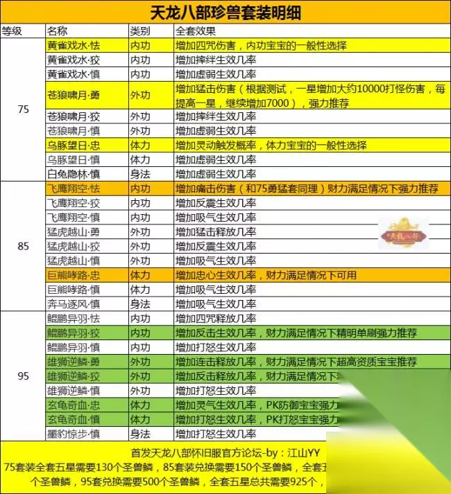 来自官方记者站的“江山YY”的攻略帖,详细注明了珍兽套装明细和全套珍兽套技能加成明细,超级实用,绝对值得收藏!
