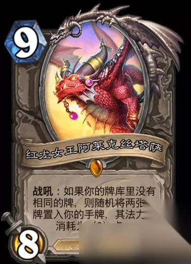 今天凌晨,美国主播红龙小姐姐发布了一张炉石传说新版本“巨龙降临”的中立橙卡,红龙女王阿莱克丝塔萨,我发布我自己? 这是一张9费8/8的随从卡,龙,战吼:如果你的牌库里没有相同的牌,则随机将两张龙牌置入你的手牌,其法力值消耗为(0)点。