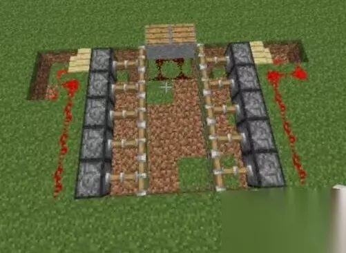 4、接着向后将地面降低一格4*4最边缘正对着放上粘性活塞,在活塞后面放上红石将活塞接好红石信号; 5、活塞中间放好石头,踩下压力板陷阱成功,最后将线路用石头围好,红石陷阱就做好了。