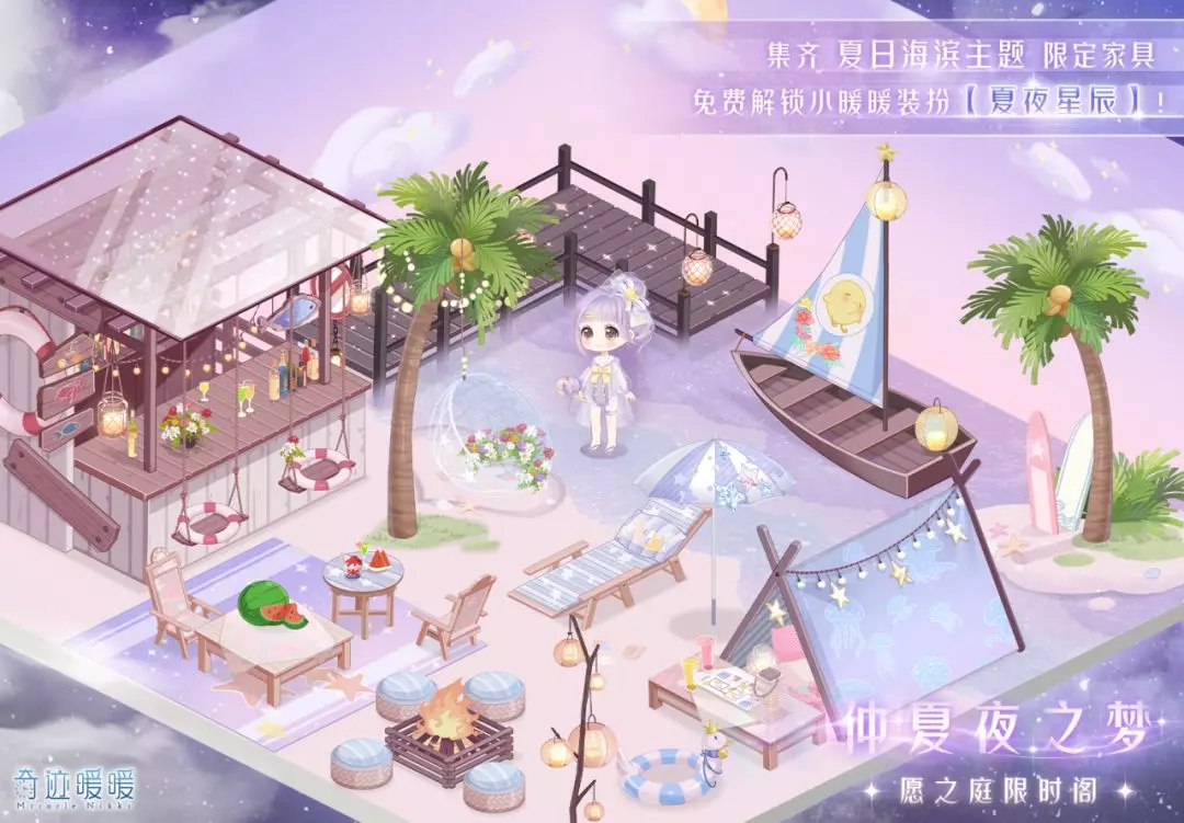 6月23日5:00—6月29日23:59,在小屋愿之庭的限时抽奖阁“仲夏夜之梦”许愿,可获得夏日海滨主题精美家具!集齐所有限定家具还可解锁小暖暖“夏夜星辰”!