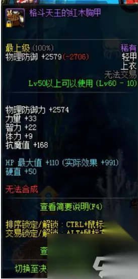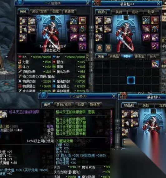 绝版格斗天王套介绍: 在红眼的身上还有一套格斗天王重甲套,回归的一个老号,格斗天王胜点套还保留着,并没有删除,而手上的是青环蛇太刀,都是很久远的装备。格斗天王重甲装备是60级的,五件重甲,所以属性是五套效果,虽然在90版本这套装属性不值得一提。但是,在当时格斗天王套单件加血量和硬直,套装也加血量,还加移速和攻速,在决斗场中,格斗天王套还是很强势的。