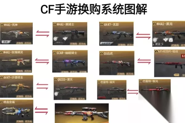 二、换购系统介绍 1、cf手游的武器换购系统有两个板块,一是普通武器升级换购,二是英雄级武器平级换购。 2、普通武器升级换购的入口在游戏商城界面的左上角。 3、值得一提的是,在换购武器的同时,原武器的精通等级将会保留。