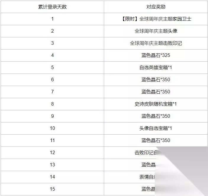 3.全球周年庆福利 【活动日期】10月12日 08:00 至 10月26日 23:59 【活动内容】超重磅好礼全球放送!活动期间累登即领史诗皮肤、自选英雄、全球周年庆主题头像、全球周年庆主题击败印记、全球周年庆主题家园卫士(限时)、2525蓝色晶石、头像自选宝箱、击败印记自选宝箱、表情自选宝箱好礼!