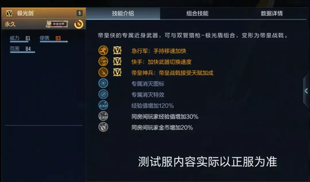 而极光剑则特殊性配置了“急行军:手持移速加快”、“快手:加快武器切换速度”及“帝皇神兵:帝皇战戟接受天赋加成”的强大属性,组合技能还可以使用技能键,播放动画变形,外观会发生变化,变成帝皇战戟,可谓集趣味和强大于一身!