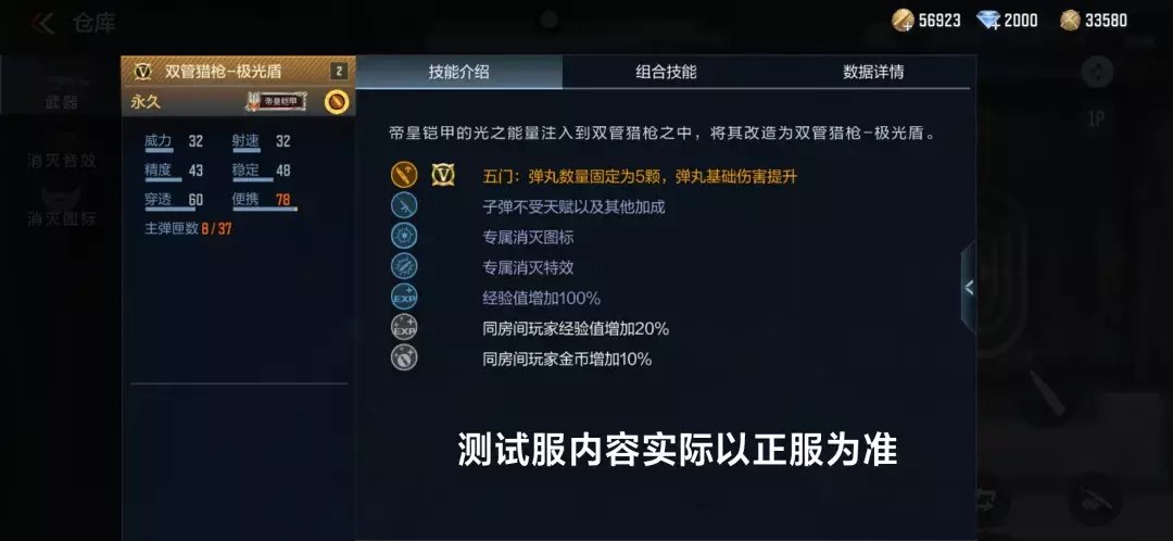 武器属性方面,双管猎枪-极光盾配置了“子弹不受天赋以及其他加成、专属消灭图标、专属消灭特效”的属性,基础威力是25点,其中的“子弹不受天赋以及其他加成”的属性仿佛刻意要这把武器保持低调。