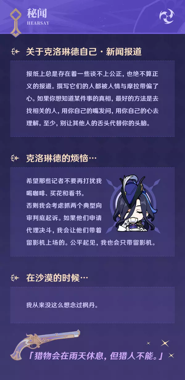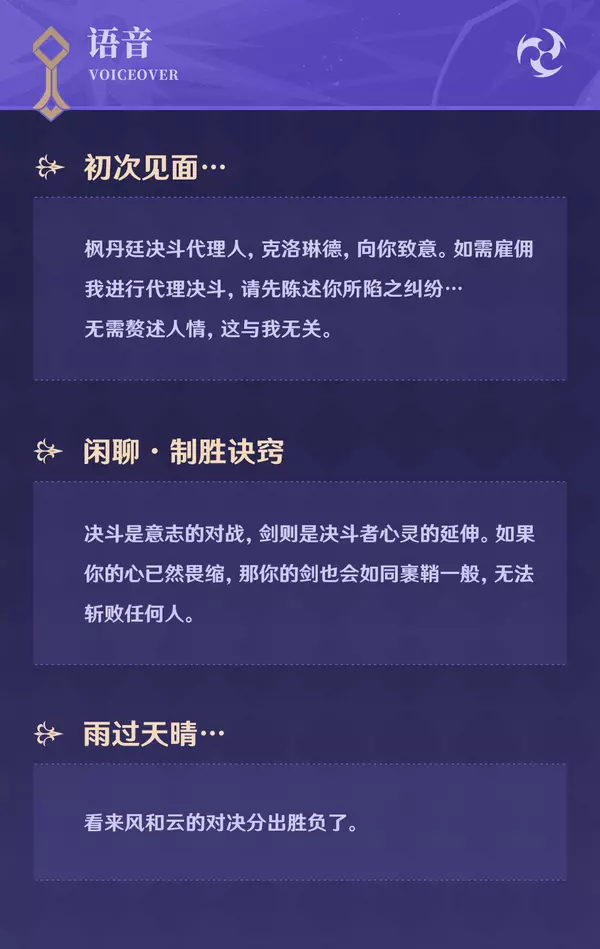 旅行者好呀!今天为大家介绍的角色是枫丹廷不败的决斗代理人,克洛琳德。她是枫丹律法与规则的代表,将以手中的剑,维护枫丹廷的「公义」。