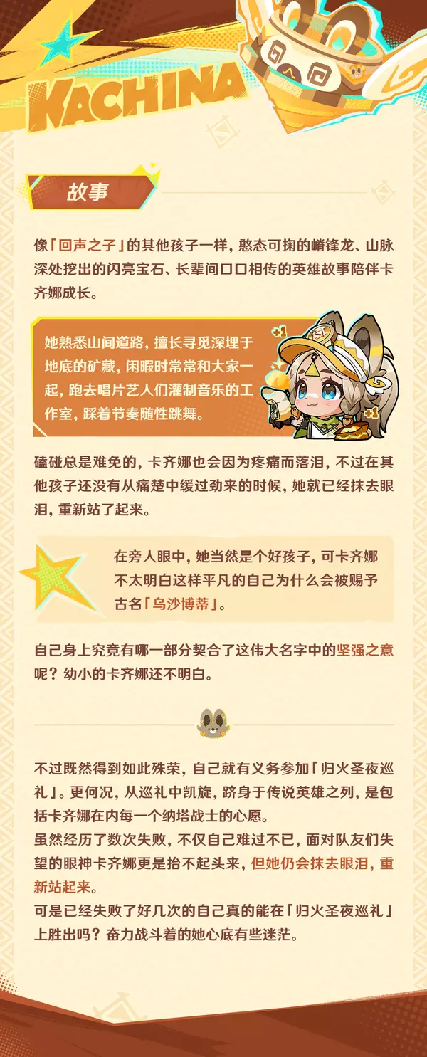 旅行者好呀!今天为大家介绍的角色是「回声之子」的卡齐娜。她是善良可爱的“小哭包”,同时也是在挫折中坚强成长的年轻战士!