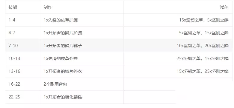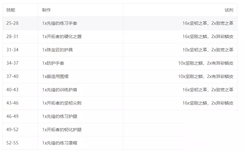 二、55-100级所需材料的总清单 55到100点: 60级之前还可以多做几个训练师配方,不过都是黄色的,而且不再给多技能点了。我建议切换到制作订单。 几乎所有可以为您提供高达100技能点的制皮配方都需要一些灵魂绑定材料,一个人去弄要弄到老,所以订单系统就很好解决了。 如果你有大量金币的话,可以按照以下材料清单进行升级,请做好心理准备,是极其多。 1、巨龙群岛制皮知识x50 2、坚韧之革x6616个 3、致密之皮x182 4、异彩鳞皮x135 5、地耀之鳞x315 6、风歌飞羽x90 7、石牙皮革x10 8、完美的龙麒角x10 9、原始熊脊骨x9 10、深海之喉x5