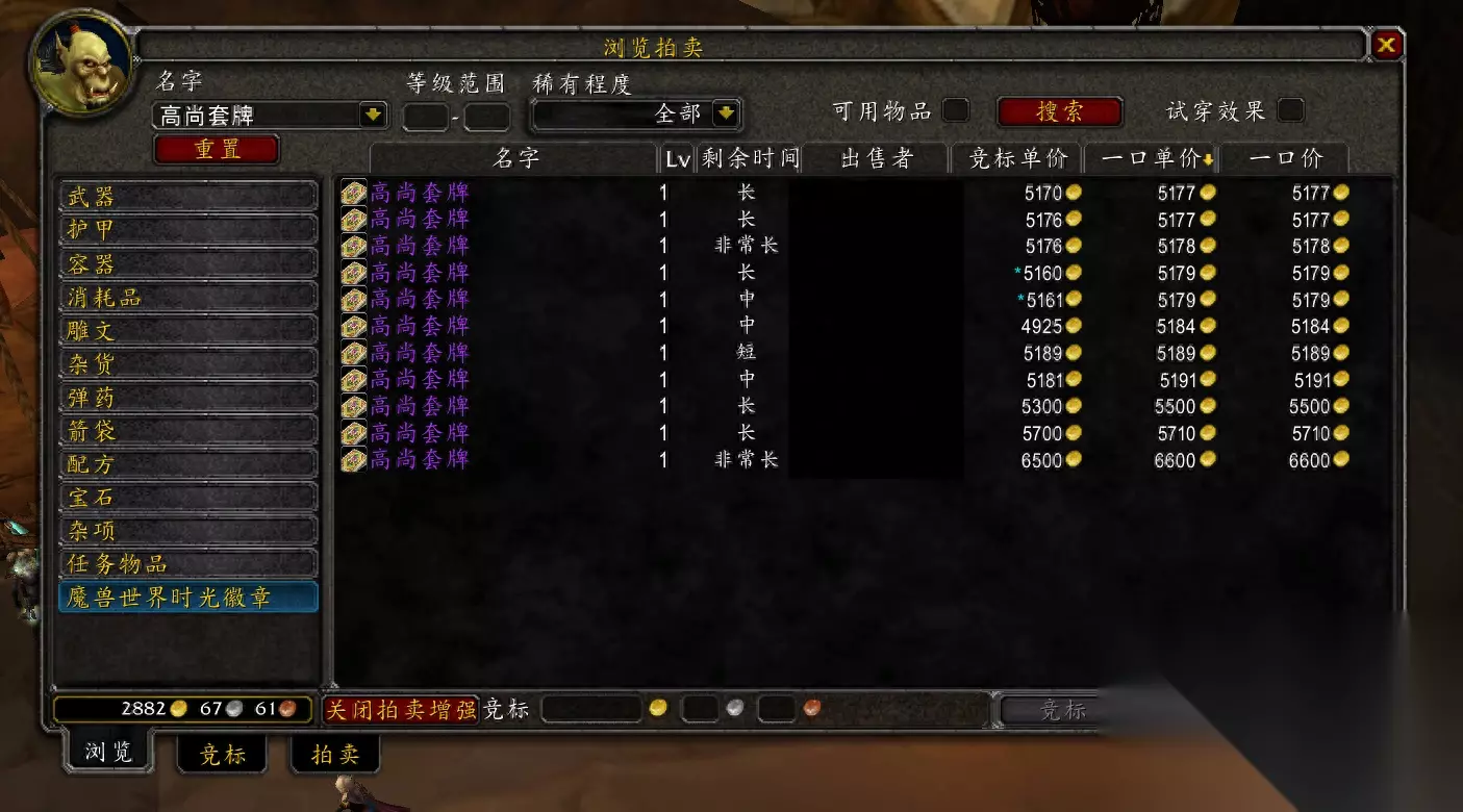 魔兽世界关机在即,肯定会有人疑问,现在还值得购买伟大卡片吗? 伟大卡片值不值得购买先不说,先来看一下它的价格,目前AH高尚套牌的价格便宜是5177金,这个价格这两天并没有什么变化,而且AH高尚套牌的数量也不多,一共有11套。祥子哥之前购买高尚套牌价格是3600金,现在看来当时的决定是正确的,不然得多花费一千多金。