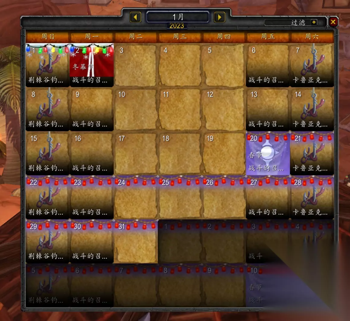 可能有人会说,现在1万金币还能值100多元,把金币卖了换成排骨还是挺香的。说的确实没错,祥子哥也无力反驳,玩游戏的态度不一样,你喜欢吃排骨,我喜欢购买装备,没有谁错谁对。 魔兽世界停服是在1月24日,大家可以查看魔兽世界活动列表,下个月的活动只有春节,和每周的钓鱼比赛,并没有每月一上线的暗月马戏团,如下图。正常情况下暗月马戏团是1个月1次,每次上线都是在月初,从图片中可以看到,1月份月初没有暗月马戏团。不知道是不是因为停服的关系,导致下个月暗月马戏团消失了。