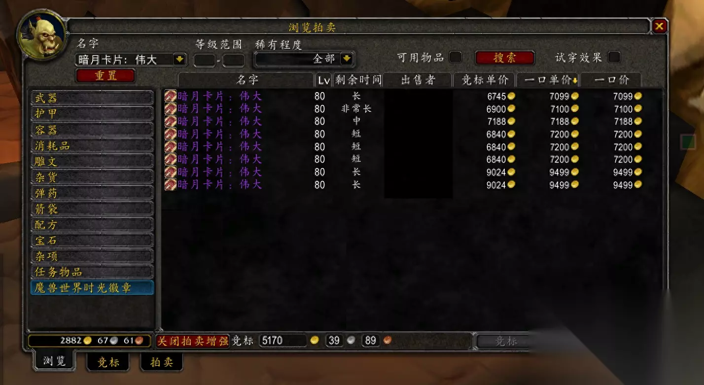 至于成品的伟大卡片,现在AH最便宜的价格是7099金,这几天伟大卡片的价格一直在6500-7500金之间浮动。普通的玩家肯定不会选择成品的伟大卡片,会购买相对便宜的高尚套牌,毕竟只要暗月马戏团来临,高尚套牌就可以兑换伟大卡片,能省几千金还是挺香的。土豪玩家则不考虑省的问题,都是在AH直接购买成品的伟大卡片,买了直接使用才符合土豪的身份。