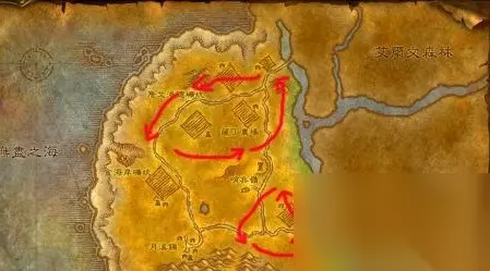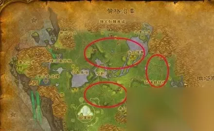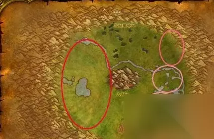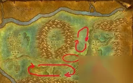 西部荒野这里你能遇到的剥皮对象有:山狗、山狗首领、血牙野猪等动物。上图是所勾勒的路线是这几个主要的轻皮“出产商”活动的范围。需要注意的是,除了陆行鸟之外,其他鸟类都不能剥皮。等到轻皮采集变绿了之后你就可以转战暮色森林了。 小贴士:如果你能去到贫瘠之地的话,哀嚎洞穴倒是一个不错的好地方,里面有很多的飞蛇以及鳄鱼等动物。