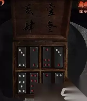 2、根据巷子中的石敢当用手机可以看到眼中的骨牌的顺序得到: 第一次出现的是:左眼:红5点、右眼:红3白1点 第二次出现的是:左眼:白5点、右眼:红2点 第三次出现的是:左眼:白7点、右眼:红8点 第四次出现的是:左眼:红1白2点、右眼:白2红4点 按照盒子上的顺序排列进去即可打开。