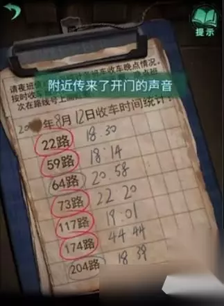 看排班表用【蓝圆珠笔】画出【64、204】路公交车,用【红圆珠笔】画出【22、59、73、117、174】路公交车,进门摆放蜡烛,用打火机点燃,探索获得【润滑剂】使用在公交车锈了的投币箱上得到【纸钱】,把纸钱用在买票窗口获得【公交卡】,放到房间里开始拼图,拼成图2的样子得到电话号码【280829】,拨号,获得【钥匙】打开公交车外左下角的箱子得到【剪刀钳】,剪开铁门上的锁,第一章结束。
