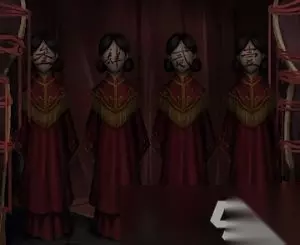 探索获得【鼓】,在右边柜子下有个五行小游戏,调整到下图的样子获得【铃铛】和【福福寿福禄寿】的线索,按照顺序去敲棺材得到【空酒杯】和【修眉刀】,地上有【牛头雕像】,回到之前的房间,在右边柜子上接【一杯酒】,铃铛摆最右架子上,左边放鼓,最左放梳子,一杯酒放到桌子上左边,联系书的线索和万寿图得知左边柜子的密码如图3所示,打开得到【猪头雕像】【羊头雕像】,在庭院的花那里使用修眉刀获得【一朵花】,桌上按照【猪羊牛】的顺序摆放雕像,把花放到左边柜子上的茶壶里,用茶杯接【一杯茶】放桌上右边,文曲星手里放上圆珠笔,按照图5摆放获得【桃木剑】,第三章交错结束。