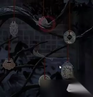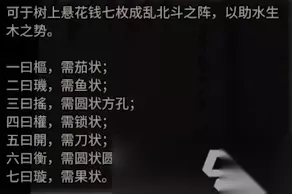 4、根据书中所说的顺序拜访树上挂的配饰: 从左到右,从上到下依次是:茄子、鱼、方孔铜钱、锁、刀、刀挂圆孔铜钱、水果。