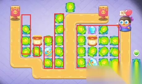5、最后放置炮塔位置如图所示,每个区域都要提前放置雪球塔,不然使用普通炮塔守不住,使用雷达的话比较吃运气并且金币没有那么多。