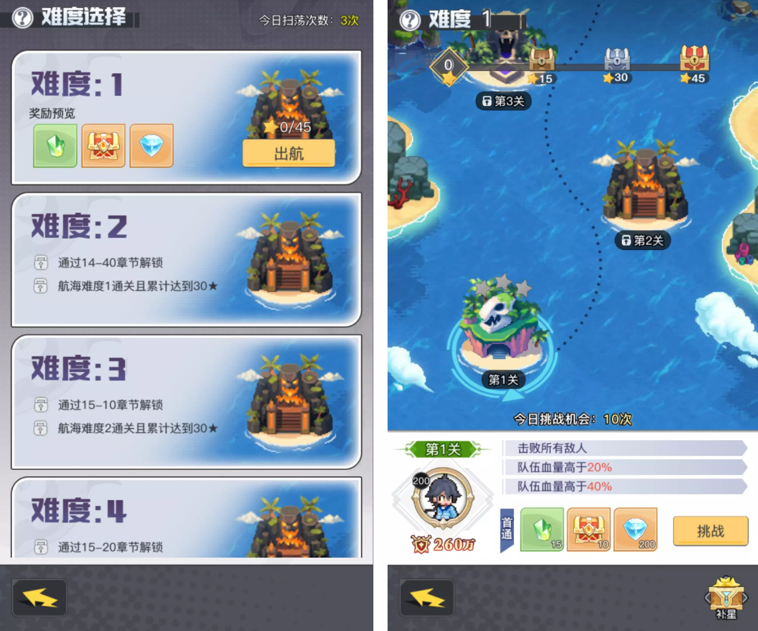 2.每个航海难度的开启需通关指定主线关卡及上一难度达到指定星数;