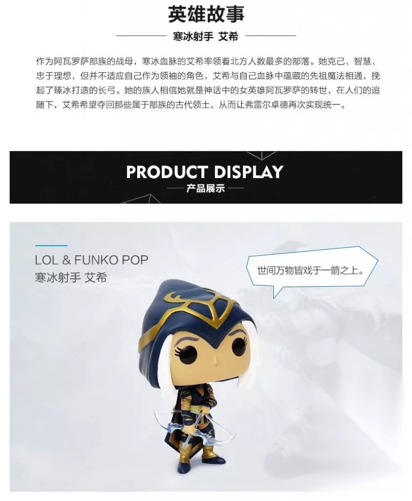 官网艾希手办 背景故事: 上古时期,弗莱尔卓德被虚空监视者所统治,里边的人类被赋予了寒冰血脉,他们的统领是三姐妹阿瓦罗萨、赛瑞尔达与丽桑卓。后来,阿瓦罗萨联合赛瑞尔达反叛了虚空监视者并且将它们丢进了嚎哭深渊里,三姐妹开始了内战,除了丽桑卓之外其他两姐妹也相继去世了。寒冰是弗莱尔卓德南部一个部族的首领,在一次躲避刺杀中偶尔来到了阿瓦罗萨的墓碑前并且得到了祖先阿瓦罗萨的冰弓,加冕为女皇并且开始联合弗莱尔卓德的其他势力,开始了对这片冰封之地的统一之路…… 阿瓦罗萨指引着我——寒冰射手·艾希。