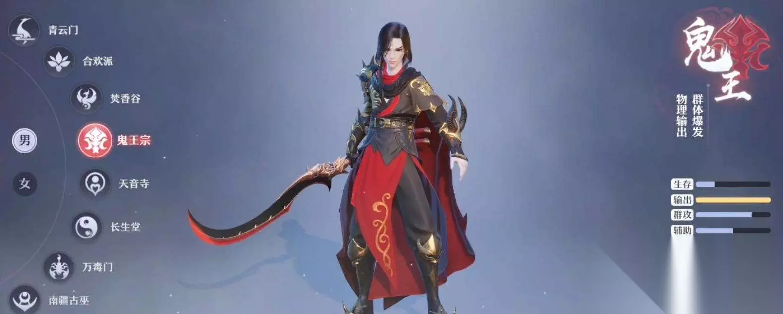 鬼王宗门派技能介绍 1、一技能-旋风斩 鬼王宗的普攻技能,可以进行单体三连击,不过实际伤害不高,比较普通。 2、二技能-鬼影步 鬼王宗的位移技能,和大部分职业的位移技能差不多,没什么好说的。 3、三技能-疯魔啸 鬼王宗的重要技能,有这个技能的鬼王宗和没这个技能的鬼王宗是截然不同的,这个技能在开局的时候就可以自动释放,不仅可以省下一个回合的时间,同时pvp战斗时就相当于获得了先手优势。