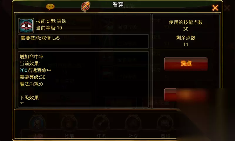 看穿:学习等级21级前置技能双倍5级,角色从21级开始每升两级可提升1级技能等级。满级10级,需要角色等级30级。 技能诠释:增加命中率。 技能效果: 1级20点远程命中,技能每提升1级加20点远程命中,满级200点远程命中。 技能效果图