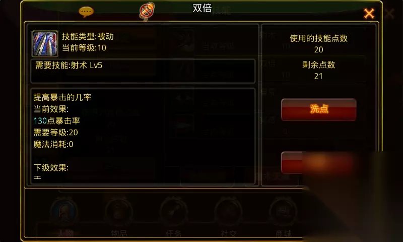 双倍:学习等级11级前置技能射术5级,角色从11级开始每升两级可提升1级技能等级。满级10级,需要角色等级20级。 技能诠释:提高暴击的几率。 技能效果:1级40点暴击率,技能每提升1级加10点暴击率,满级130点暴击率。 技能效果图