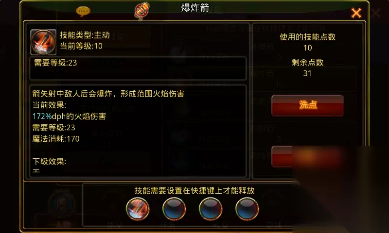 爆炸箭:学习等级5级,角色从5级开始每升两级可提升1级技能等级,满级10级,需要角色等级23级。 技能诠释:箭矢射中敌人后会爆炸,形成范围火焰伤害。 技能伤害:1级100%dph火焰伤害,技能每提升1级火焰伤害提升8%,满级172%dph火焰伤害。 技能效果图