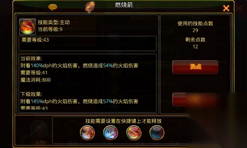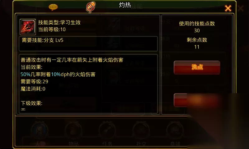 灼热:学习等级11级前置技能分支5级,角色从11级开始每升两级可提升1级技能等级。满级10级,需要角色等级20级。 技能诠释: 普通攻击时有一定几率在箭矢上附着灼热伤害。 技能效果: 1级5%几率附着10%dph的灼热伤害,技能每提升1级加5%几率,满级50%几率附着10%dph的灼热伤害。 技能效果图