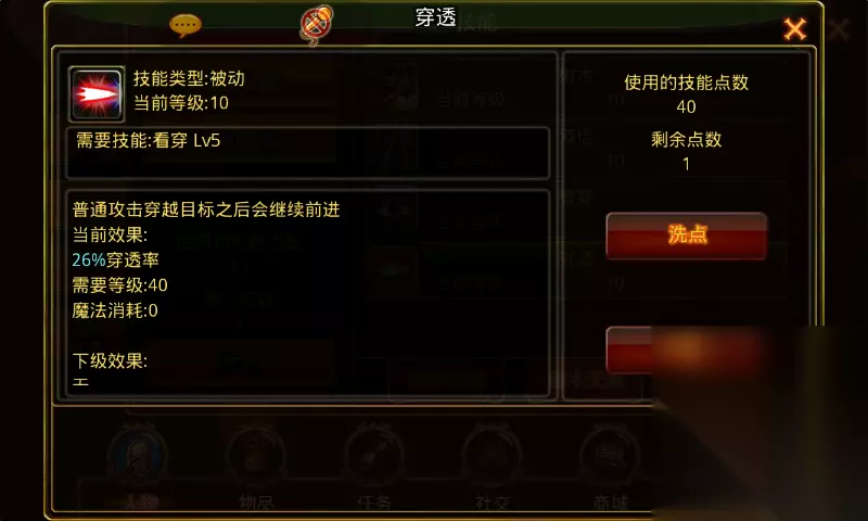 穿透:学习等级31级前置技能看穿5级,角色从11级开始每升两级可提升1级技能等级。满级10级,需要角色等级40级。 技能诠释:普通攻击穿越目标之后会继续前进。 技能效果:1级8%穿透率,技能每提升1级加2%穿透率,满级26%穿透率。 技能效果图