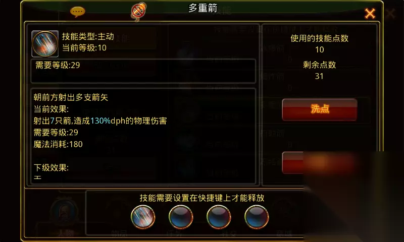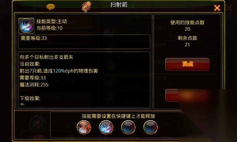 扫射箭:学习等级15级,角色从15级开始每升两级可提升1级技能等级,技能每提升两级射出的箭矢增加1支,满级10级可射出7支箭矢,需要角色等级33级。 技能诠释:向多个目标射出多支箭矢。 技能伤害:1级75%dph物理伤害,技能每提升1级物理伤害提升5%,满级120%dph物理伤害。 技能效果图
