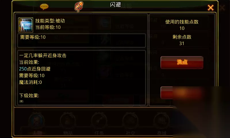 被动技能图解篇 闪避:学习等级1级,角色从1级开始每升1级可提升1级技能等级。满级10级,需要角色等级10级。 技能诠释:一定几率躲开近身攻击。 技能效果:1级25点近身回避,技能每提升1级+25点近身回避,满级+250点近身回避。 技能效果图