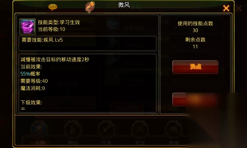 微风:学习等级31级前置技能疾风5级,角色从31级开始每升1级可提升1级技能等级。满级10级,需要角色等级41级。 技能诠释:减慢被攻击目标的移动速度2秒。 技能效果:1级10%概率,技能每提升1级加5%概率。满级55%概率。 技能效果图