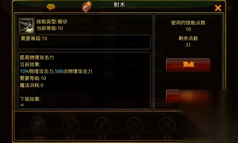 射术:学习等级1级,角色从1级开始每升1级可提升1级技能等级。满级10级,需要角色等级10级。 技能诠释:提高物理工攻击力。 技能效果:1级1%物理攻击力50点物理攻击力,技能每提升1级加1%物理攻击力50点物理攻击力。满级10%物理攻击力500物理攻击力。 技能效果图