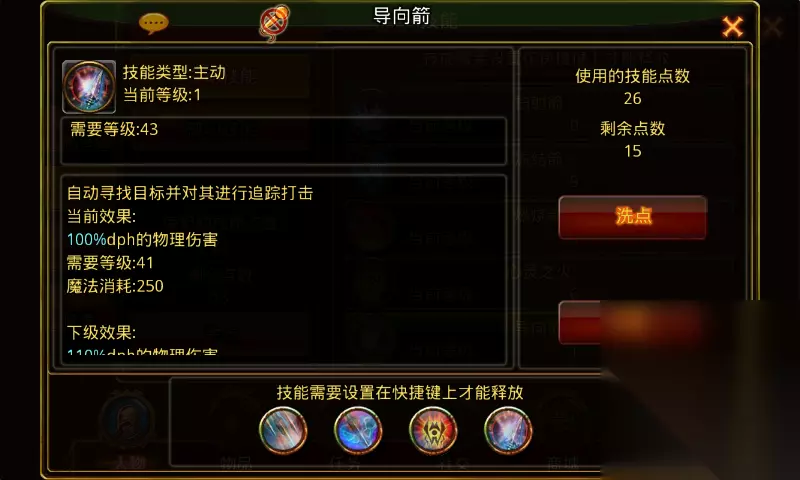 导向箭:学习等级41级,角色从41级开始每升两级可提升1级技能等级。满级1级,需要角色等级41级。(注:技能10级需角色59级) 技能诠释:自动寻找目标并对其进行追踪打击 技能伤害:1级100%dph物理伤害,技能每提升1级物理伤害提升10%dph物理伤害。满级190%dph物理伤害。 技能效果图