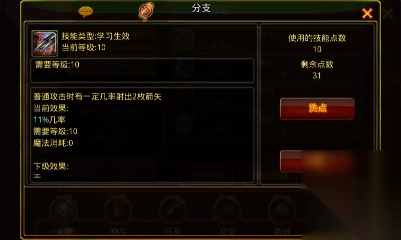 分支:学习等级1级,角色从1级开始每升两级可提升1级技能等级。满级10级,需要角色等级10级。 技能诠释:普通攻击时有一定几率射出2枚箭矢。 技能效果:1级2%几率,技能每提升1级加1%几率,满级11%几率。 技能效果图