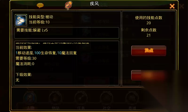 疾风:学习等级21级前置技能躲避5级,角色从21级开始每升1级可提升1级技能等级。满级10级,需要角色等级30级。 技能诠释:提高移动速度,提高生命和魔法的恢复速度。 技能效果:1级1点移动速度10点生命恢复1点魔法回复,技能每提升1级+10点生命恢复和1点魔法回复,满级1点移动速度100生命恢复10魔法回复。 技能效果图
