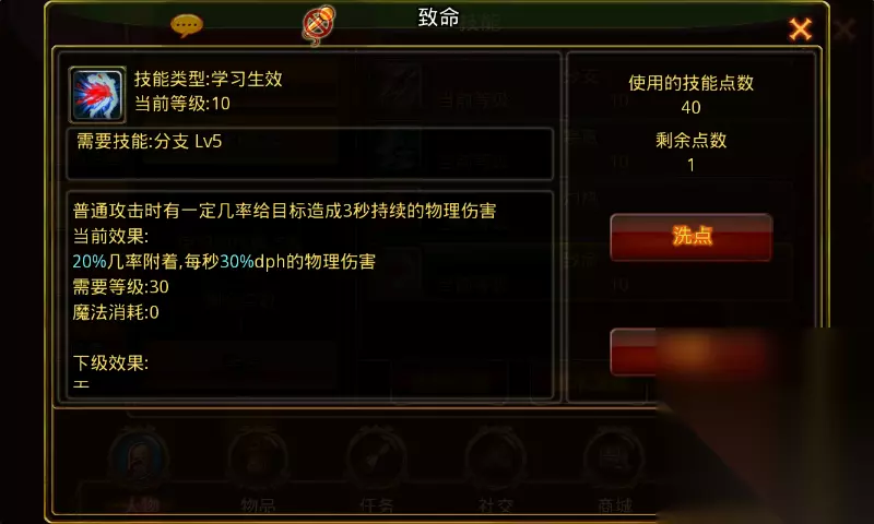 致命:学习等级31级前置技能分支5级,角色从31级开始每升两级可提升1级技能等级。满级10级,需要角色等级40级。 技能诠释:普通攻击时有一定几率给目标造成3秒持续的物理伤害。 技能效果:1级2%几率附着每秒30%dph的物理伤害,技能每提升1级加2%几率,满级20%几率附着每秒30%dph的物理伤害。 技能效果图