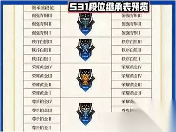 王者荣耀s31更新时间及段位继承表一览 1、王者荣耀s31赛季开始时间:2023年4月13日(赛季延迟更新) 2、目前网上关于王者荣耀s31赛季爆料已经很多了,有很多英雄人物都会进行调整,技能上也很多升级,大家可以期待一下。 s31赛季段位继承表: 1、传奇王者:继承到星耀2 2、无双王者25-34星:继承到星耀五 3、最强王者10-24星:继承到钻石一 4、最强王者0-9星:继承到钻石二 5、星耀一:继承到钻石三