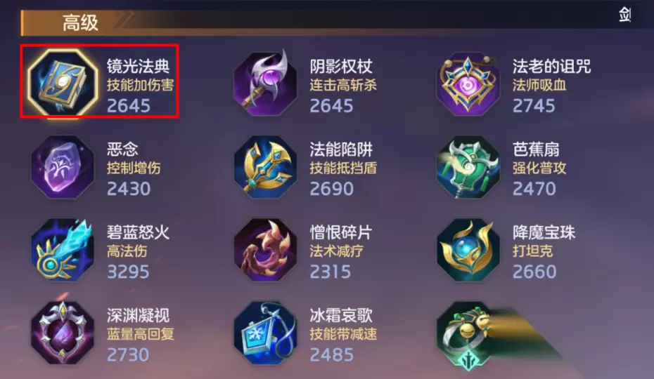 出装方面首推法伤鞋,加移速加法强提高法术伤害,性价比高。然后是“镜光法典”高法强技能急速,在对敌人使用技能的时候会额外附加法伤并提升移速,同时提供30点的法穿,之所以选择这件装备是因为诸葛亮是一个频繁切技能的英雄,所以可以利用到这个技能附加伤害,而且15%的移速加成也让诸葛亮可以与敌人拉扯。 后续出装可以考虑用“阴影权杖”180法强350生命8%吸血45点法穿,技能/普攻打中敌人给对方叠加4层印记,每次攻击减少1层造成额外法术伤害,全部清除则可以造成15%已损失生命值的法伤,对付残血和大肉英雄收割效果很。剩余出装是继续堆法强还是出法穿,则可以视敌方阵容与出装来定。