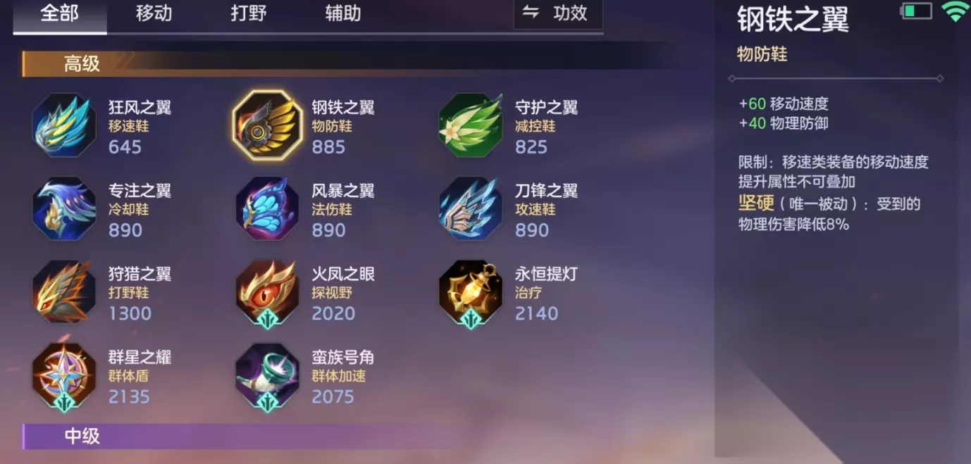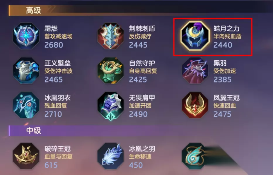 第四个大件出“皓月之力”,40物攻750血量,在受到敌方伤害后会得到一个持续回血的buff最多能叠6层,同时在自身血量降到25%以下的时候得到一个12%最大血量的护盾,每一层buff会有额外的攻击和护盾值加成,越是残血越是能迸发出强大的战斗力。重装战士要考虑如何在不降低自身坦度的情况下提供尽可能多的输出,皓月之力无疑是一件很不错的装备。 第五个大件用“崇高信念”,105物防115法防,获得抵挡技能的法术护盾,触发护盾的时候还会得到一个12%最大生命值的护盾,来自敌人的伤害是多样的,尤其是一些关键性技能,为了能顺利开团不被限制,这种双抗护盾装外加能抵消一次技能,就很适合战士。
