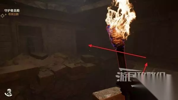 将锤子扔到对面指引处,然后拿起火把走过去,使用锤子将墙敲碎继续前进。