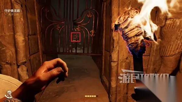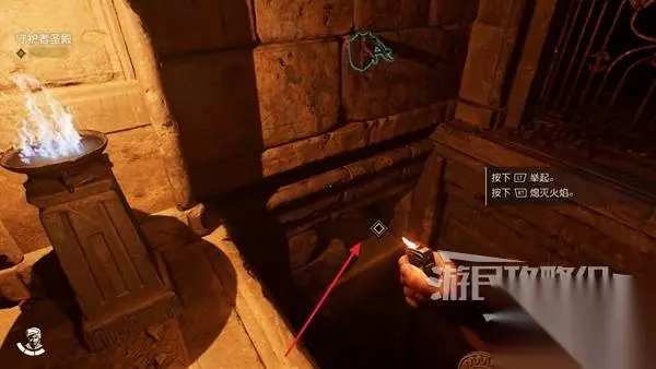 剧情结束我们与吉娜一块掉进了下方区域,周围有很多蝎子,先与角落的锁链互动开启左侧的大门,进入里面房间拿到一个火把。