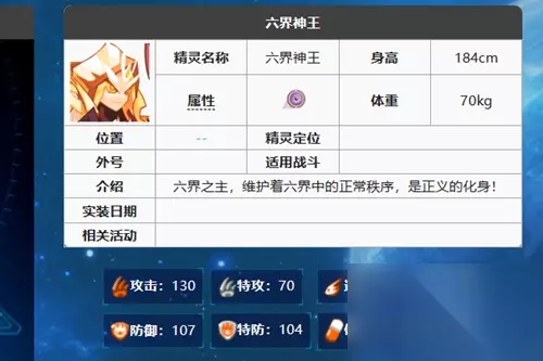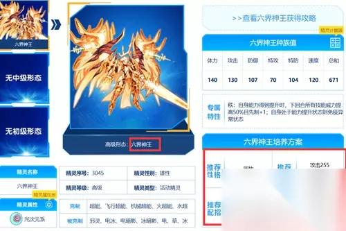 5、六界神王是一只光次元系的精灵,其总能力值高达671。 6、其中,物攻和速度的数值相对较高,因此可以被培养成团队中的主力特殊攻击角色。你可能想看: 六界神王如何获得