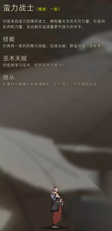 部落与弯刀蛮力战士技能介绍 技能:蛮力战士的技能有很多,有一系列的格斗技能:如头槌、野蛮冲撞、跃斩等 部落与弯刀蛮力战士天赋介绍 天赋:蛮力战士非常野,他拒绝学习巫术,所以巫术天赋为0。 部落与弯刀蛮力战士随从介绍 随从:他曾经与熊角力井获得胜利,它们加入了蛮力战士的冒险队伍。