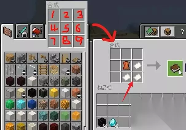 4加皮革合成书合成纸之后,把纸放在第6格,第8格,第9格,把皮革放到第五格,这样就合成了书。