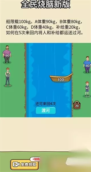 全民烧脑新版是一款单机闯关类游戏,每一关卡的玩法都不同,针对每一个关卡需要玩家开启小脑袋,针对不同关卡给予不同玩法,新版游戏通关玩法是什么?卡在关卡中无法通关的小伙伴赶紧来下文瞧瞧。 全民烧脑图文通关玩法 【第一关】 船限载100kg,A体重90kg,B体重80kg,C体重60kg D体重40kg,补给重20kg,如何在5次来回内将人和补给都运送过河。