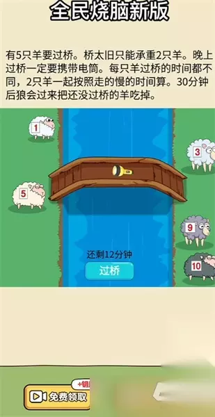 关卡解答: 1和3打手电过桥,1打手电回到桥头,6/10打手电过桥,3打手电回到桥头,1/3打手电过桥 【第四关】 有5只羊要过桥,桥太旧只能承重2只羊,晚上过桥一定要携带电筒,每只羊过桥的时间都不同,2只羊一起按照走的慢的时间算,30分钟后狼会过来把还没过桥的羊吃掉。